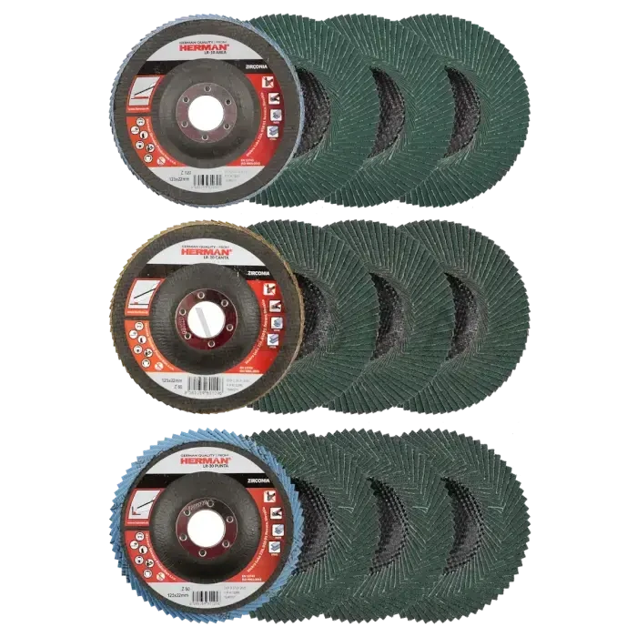 Kompletní sada 12 různých lamelových kotoučů o Ø125mm s lamelami s vrstvou zirkoniových zrn se zrnitostí P40, P60, P80, P120.